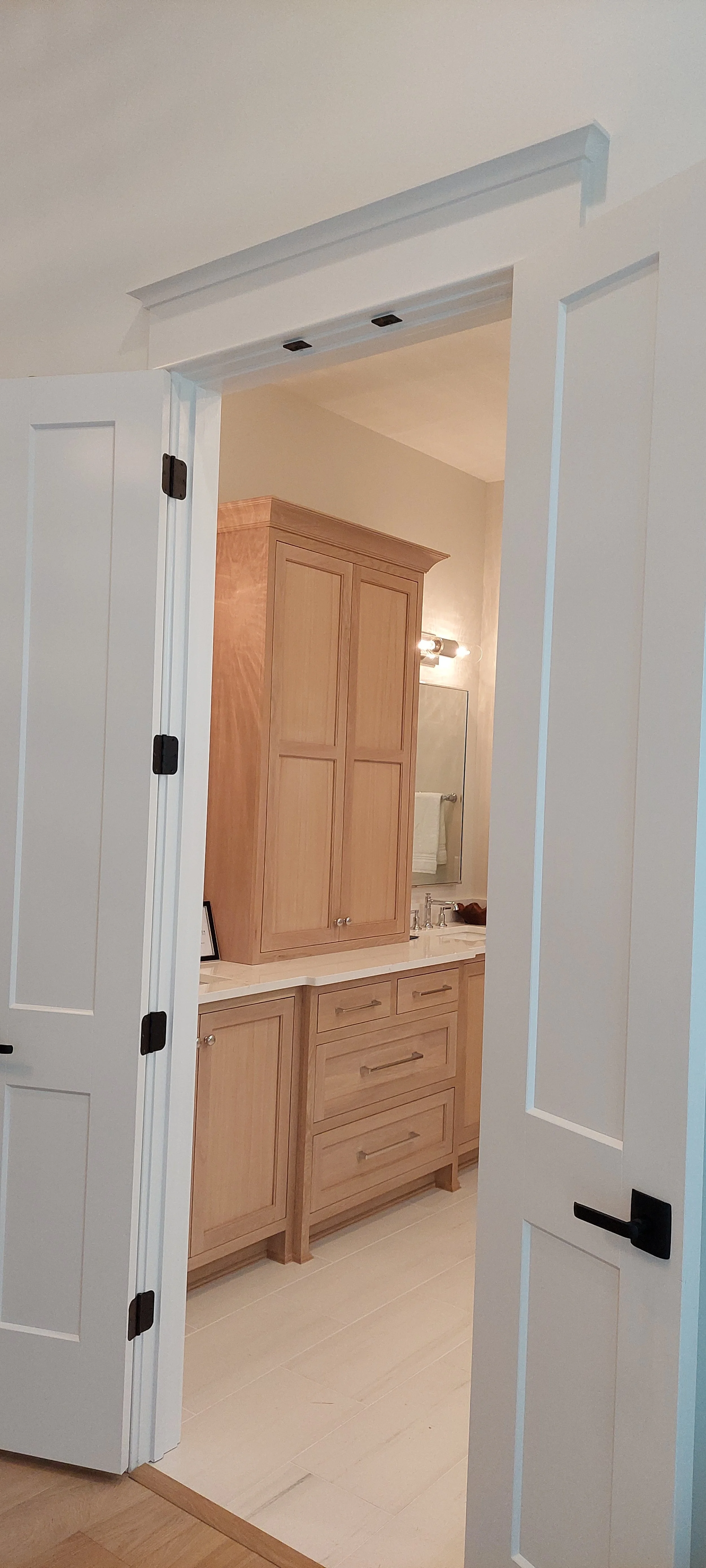 The Master Ensuite was a stunner. Separate basins with white marble tops and central timber cabinets for storage - beautiful and practical. I also looooved these shaker doors throughout with the chunky black hardware!